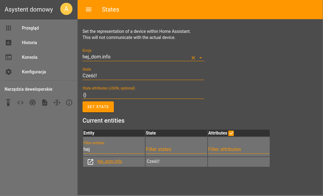 W informacjach o stanie encji systemu możemy już odszukać nasz nowo dodany element systemu (encja hej_dom) i zobaczyć jego status oraz atrybuty