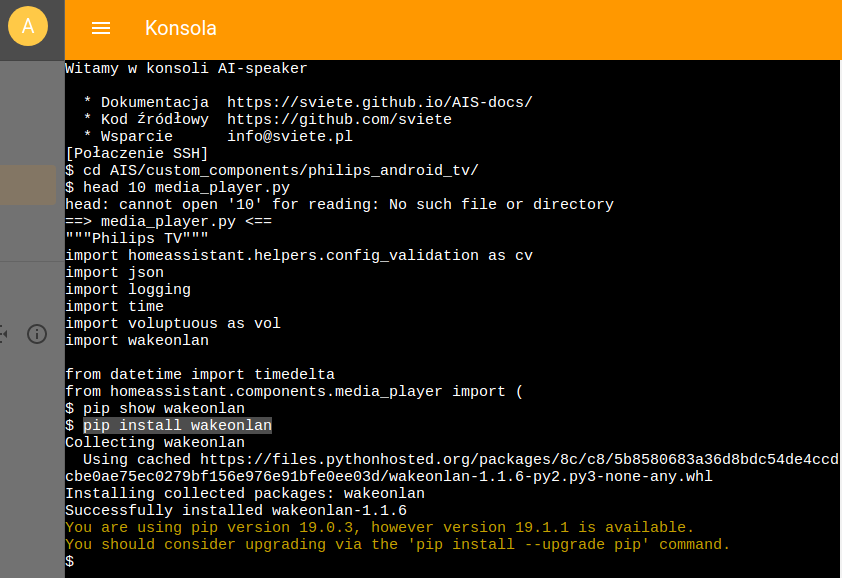 W konsoli przechodzimy do folderu z konfiguracją Asystenta domowego