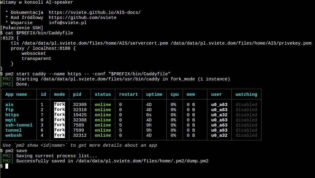 • zapisz ustawienia menadżera usług komendą pm2 save - usługa https będzie już domyślnie uruchamiana po restarcie bramki